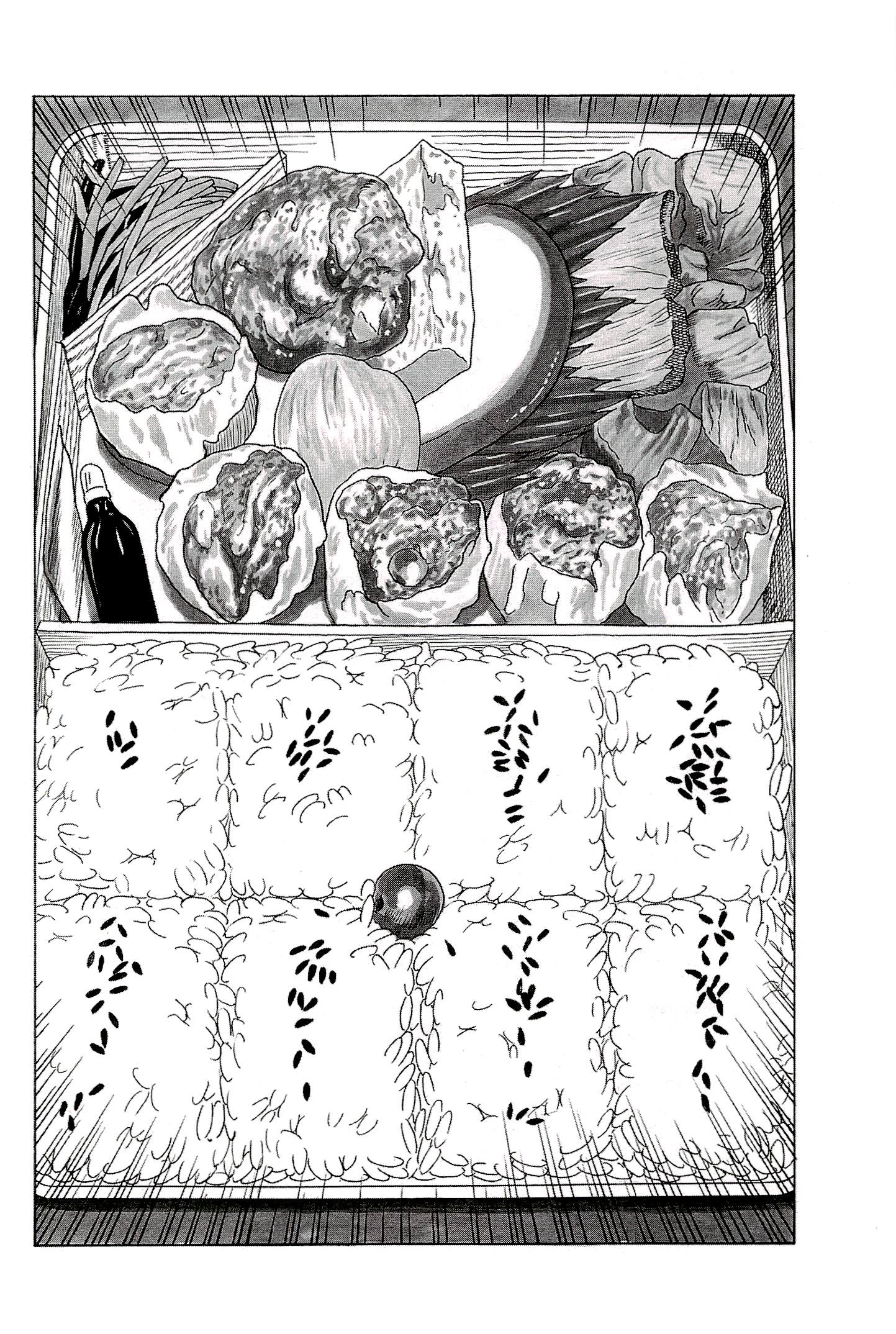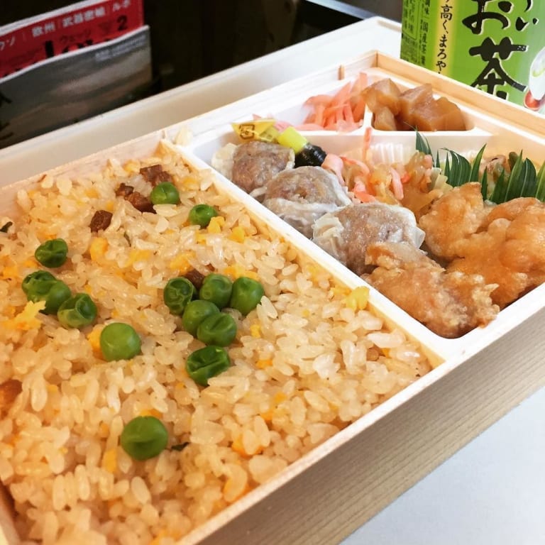 シウマイ 5個も入っていてうまい 唐揚げ ジューシィでうまい 卵焼き 甘くてうまい かまぼこ プリプリしてうまい 竹の子煮物 甘しょっぱくてうまい。一番うまい 焼き魚 パサパサでうまい 昆布 ご飯のおかずになってうまい 紅生姜 口直しでうまい あんず 甘酸っぱくてうまい 小梅 カリカリでうまい ご飯 底にへばりついてうまい