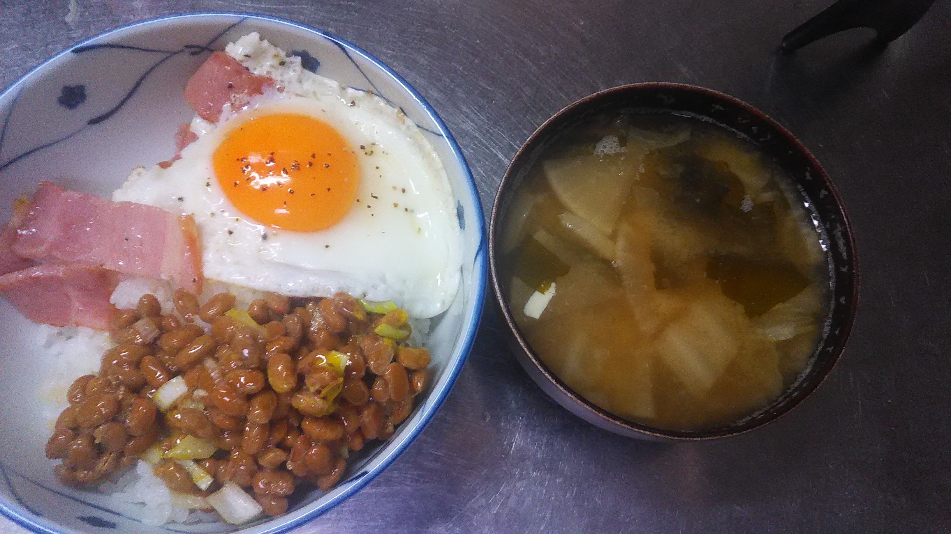 俺のお気に入りのおすすめメニュー、どんぶりメシにベーコンエッグと納豆のダブルトッピング