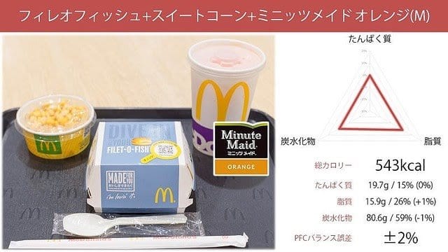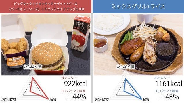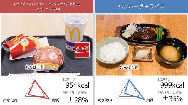 右側の画像がさも普通の食事の様に比較されているが、緑黄色野菜が殆どない。グラフ出すまでもなく糖肉脂塩や。どうせ不健康なメシ食うならマックでも一緒という事でしかない