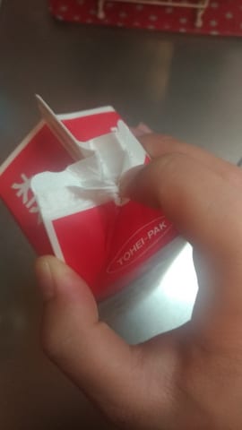 3.Xの対角線上の2か所をつまんで引っ張ると開封される(Xの/の部分というか、隣り合っていない部分というか)