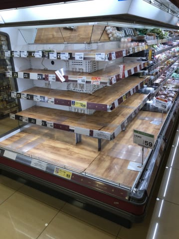 今スーパーで棚空っぽにして小出しに商品だしたら、