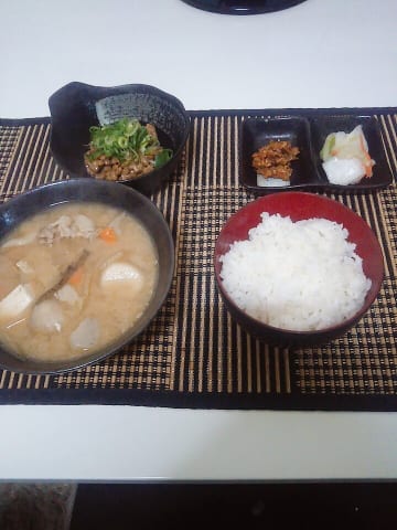 いいね、納豆は要らんから海苔つけて。豚汁に油揚げ入れるんだけはやめてーや。大嫌いなんや