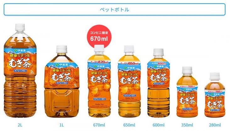 何度か商品名を変更し、2010年に「天然ミネラルむぎ茶」の600ミリリットル、12年に「健康ミネラルむぎ茶」の630ミリリットルを発売した。 その後、15年に650ミリリットル、16年に670ミリリットルを発売し、現在に至るという。