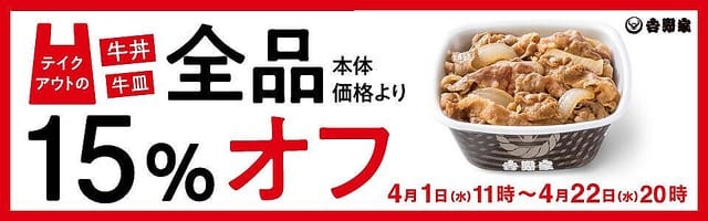 現在、牛丼「並盛」持ち帰り税込300円を開催中の大手牛丼チェーン「吉野家」では、2020年4月1日11時から、「テイクアウト牛丼・牛皿15%オフキャンペーン」を行います。
