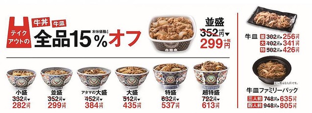 たとえば通常352円の牛丼「並盛」は299円、通常302円の牛皿「並盛」は256円で提供されます。(いずれも税別)