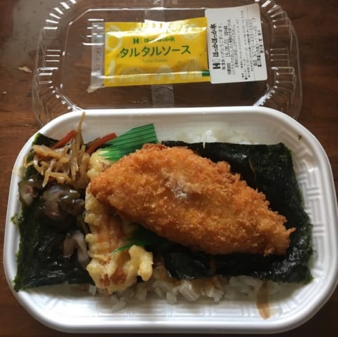 ご飯、おかか、海苔の三層にちょっと醤油かけて、タルタル白身フライと磯辺揚げをかじりながら食べていく。天才の発明やな。