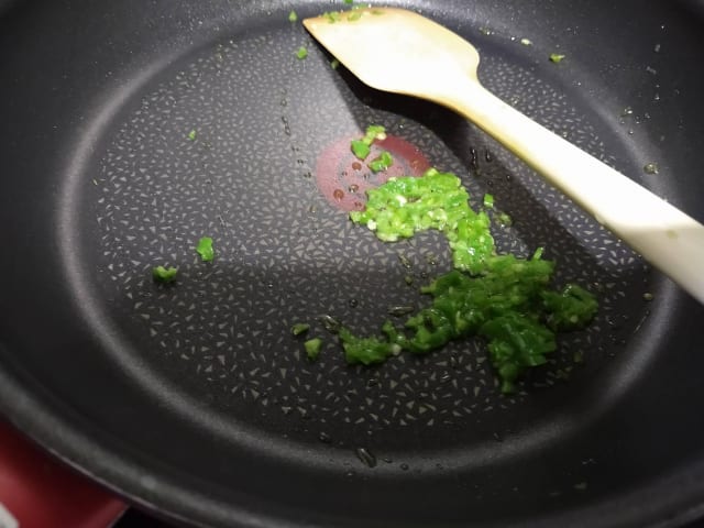 青唐辛子を痛めたフライパンに、入れて煮込みます