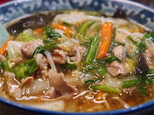 もやし、キャベツ、ニンジン、ニラ、キクラゲ、豚の細切りのオイスター味のあんかけが乗ったラーメンだよ