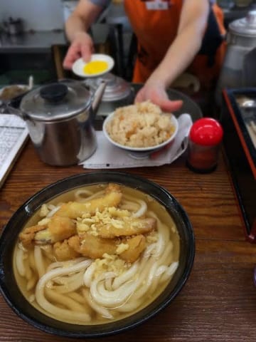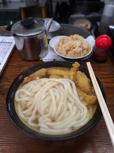 豊前裏打会系のやつが勢いがあるよね。ごぼてんかうどん丸天うどん。ご飯はいなりかかしわのおにぎりかかしわのご飯。この組み合わせなら問題ない。