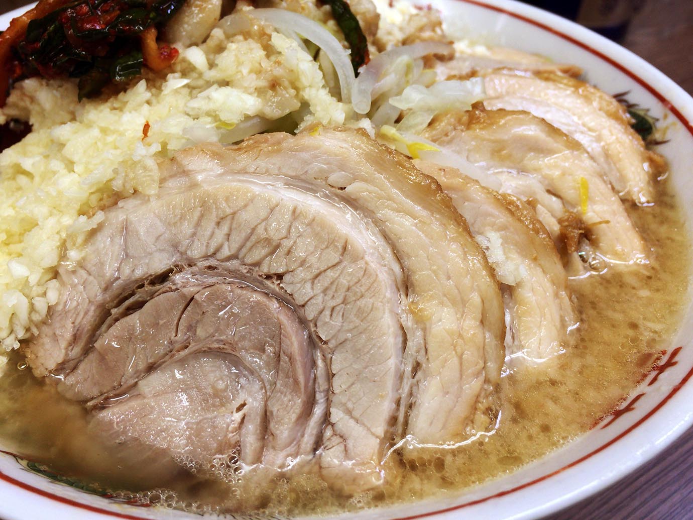 分厚いブタをニンニクとあの異常な低加水麺でかぶりつく