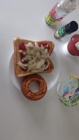 今朝の朝食1/2サイズのピザトースト、小鉢のサラダ、アーモンド7粒、プルーン一つ、キーウィ半分、バナナ半分、りんご1/4、小鉢のヨーグルト(レーズン、きな粉、オリゴ糖入り)麦茶時間を掛けて400cc