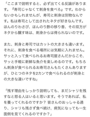 こういうのをへりくつと言う。わざわざ店で食わんでもスーパーで買った寿司でいいじゃん。シャリ残しても誰も嫌な思いせんですむ