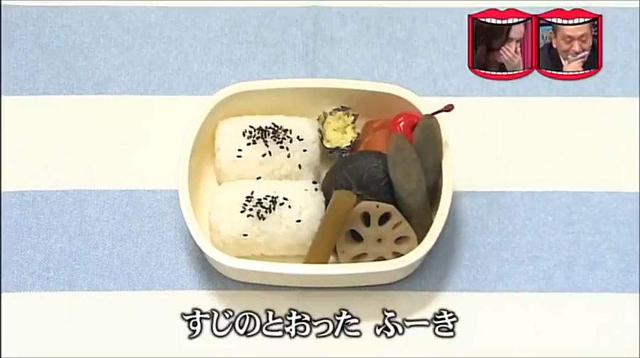 おにぎり以外の部分は素材には言及されてるけど調理法には触れていないから天ぷら弁当ってことにすれば割とイケると思うぞ。全部煮付けとかでイメージすると貧相になる