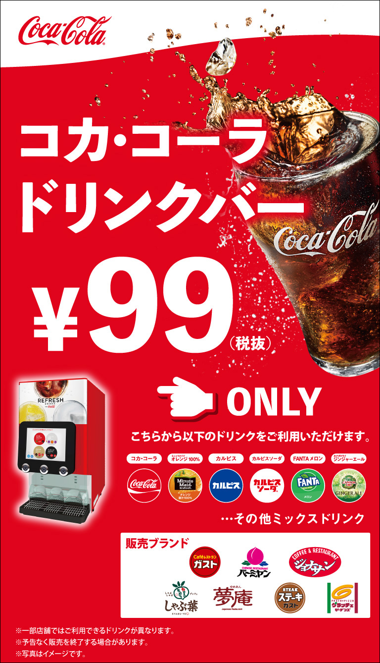 99円でガストにずっと籠れるぞ 店によってはドクターペッパーもあるから神や https://www.skylark.co.jp/gusto/menu/coke_campaign/index.html