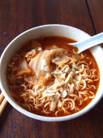 >インスタントラーメンにキムチとチーズ乗せて胡椒かけるの美味いわ