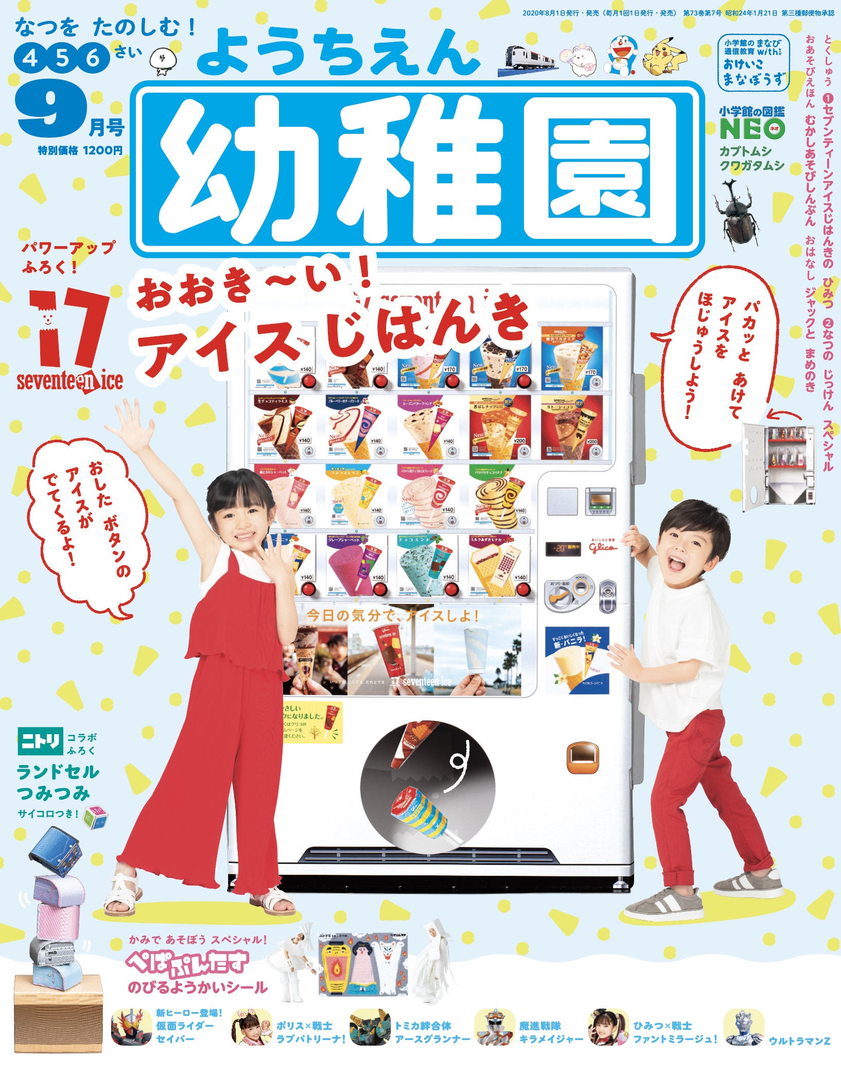 付録は「グリココラボ セブンティーンアイスじはんき」「ニトリコラボ ランドセルつみつみ」園児の知育学習雑誌『幼稚園』9月号 付録 「セブンティーンアイスじはんき」 ほしいアイスを選べたり、自販機のパネルも付け替えられるので、自分だけの自販機をカスタムしましょう! また、自販機のドアが開くのでアイス補充の体験もできます! 昨年のアイス自販機ふろくから遊びのバリエーション、大きさ、アイスの種類などさらにパワーアップしました! https://sho.jp/youchien/53528