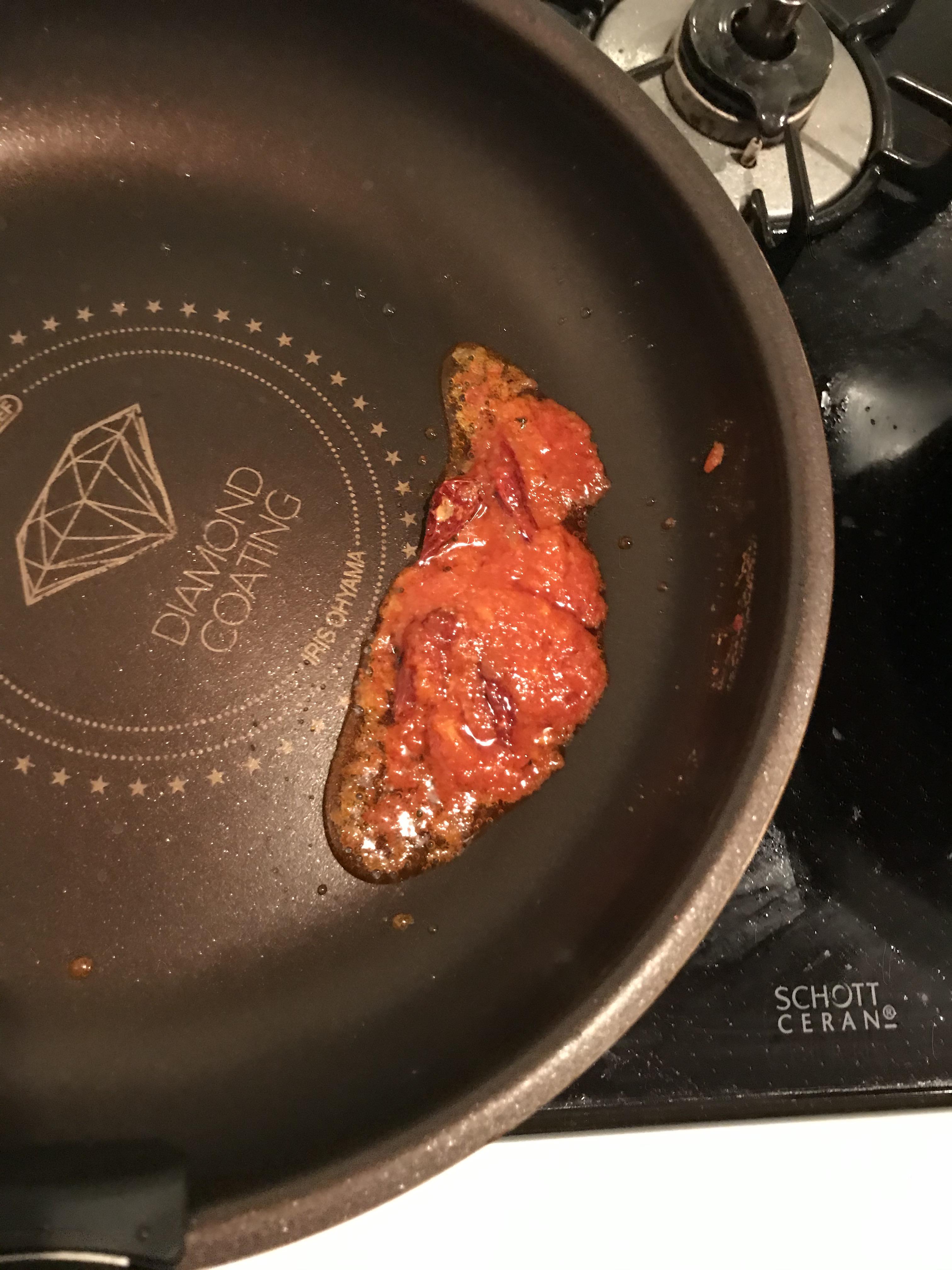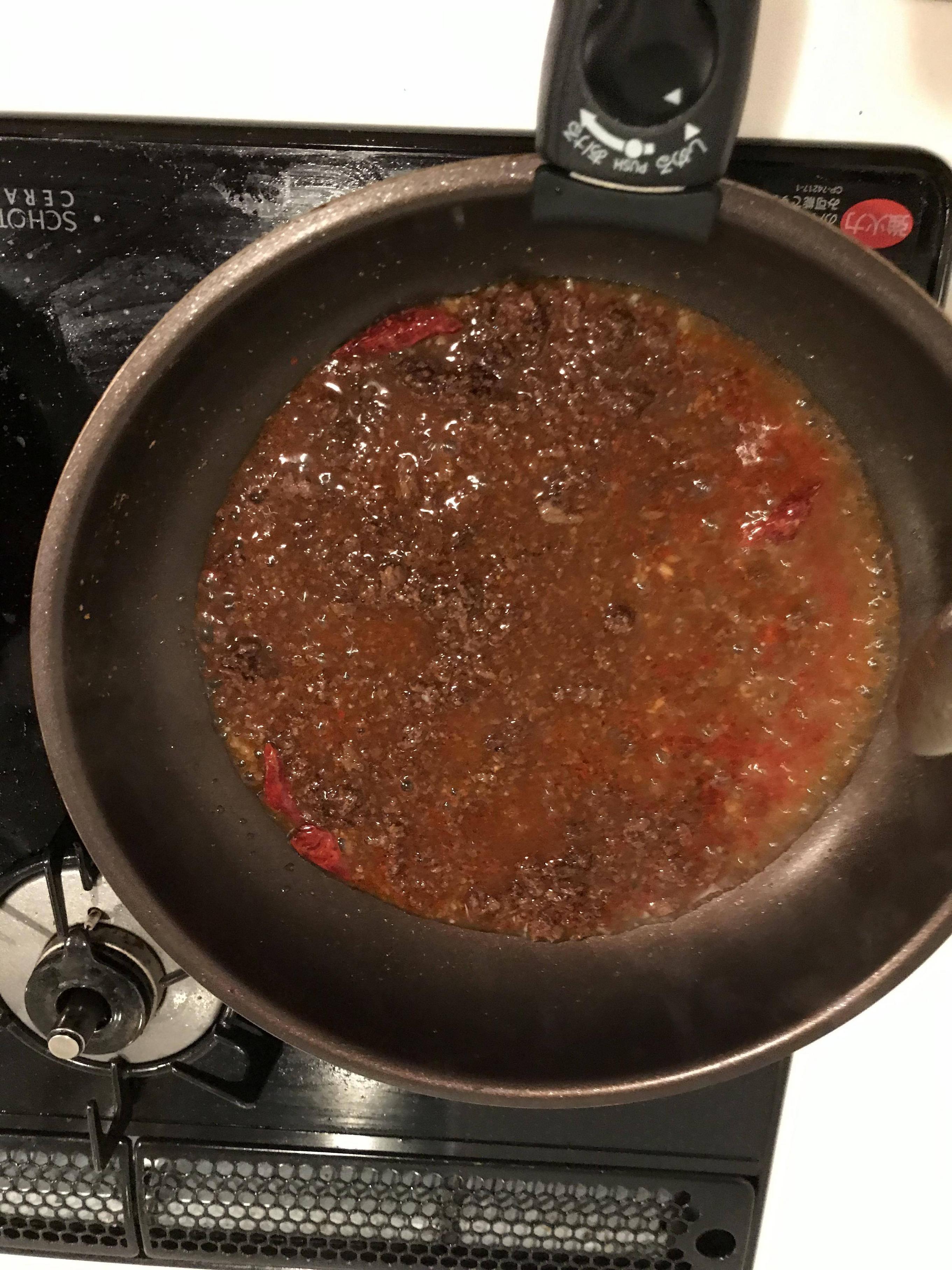 油熱したら、弱火で唐辛子・豆板醤・しょうがとニンニクチュープを香りが出るまで炒めるで