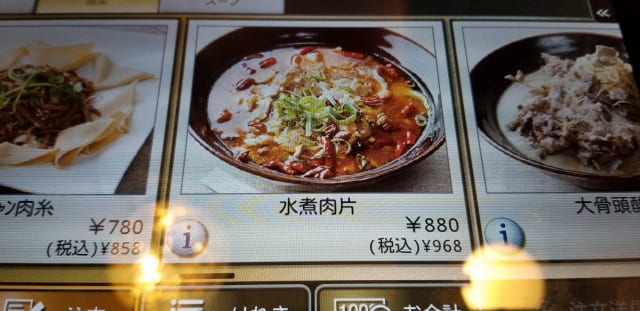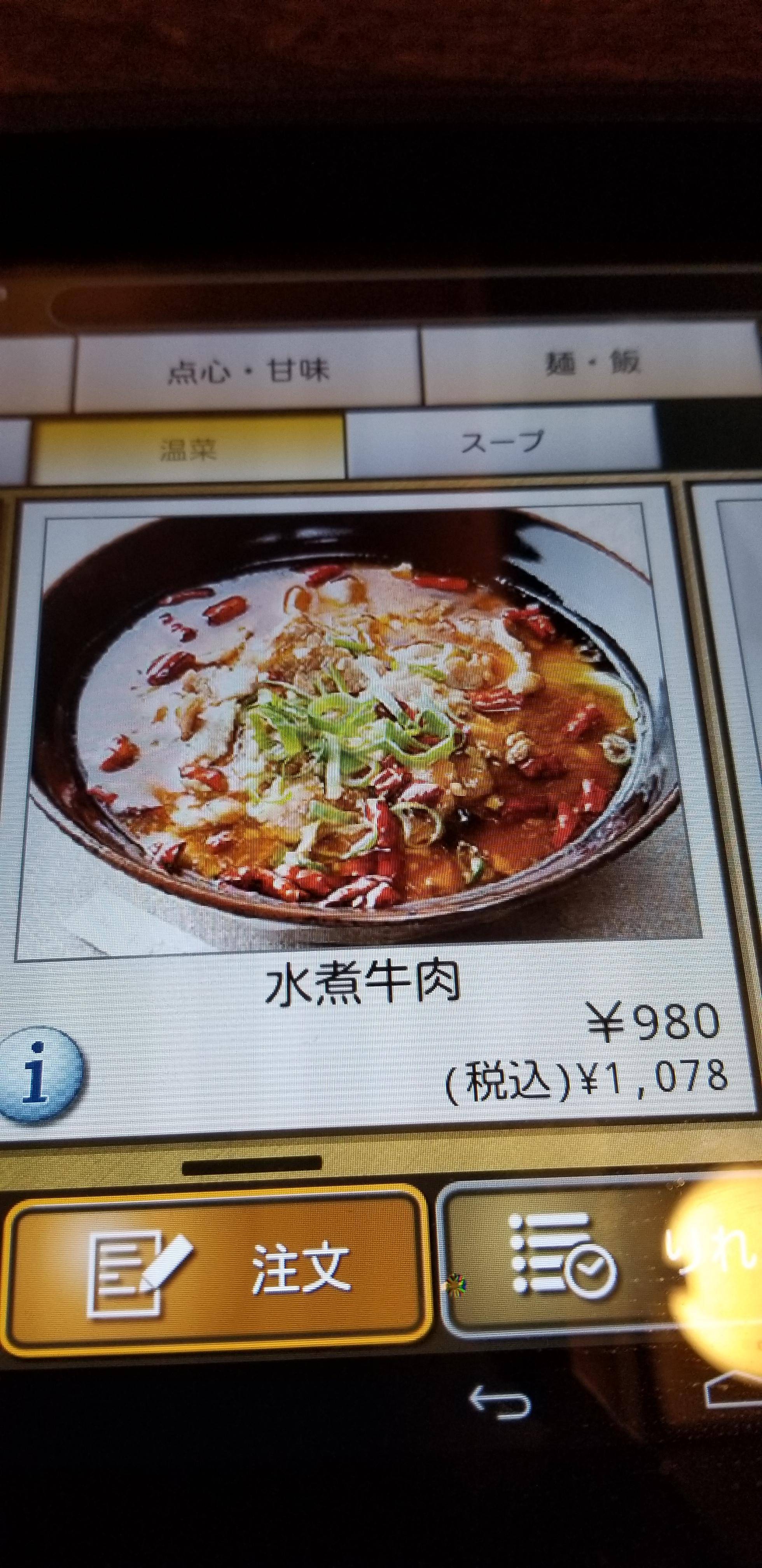水煮牛肉は日本では1000~1300円という安さでありがたい。支那で食べる方が感覚的に高く感じる