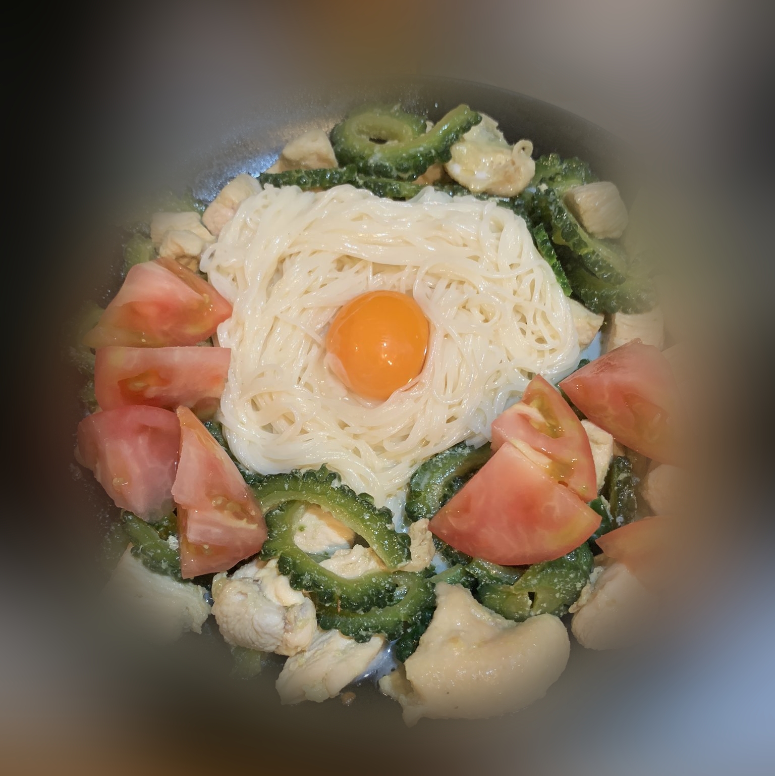 ゴーヤと卵と素麺でチャンプルーにしたあとトマト添えればマシになるやろ