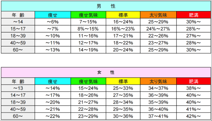 へぇと思ってWikipedia見てきたら15-19%が適正な体脂肪率で、これ以上は肥満って書いてある