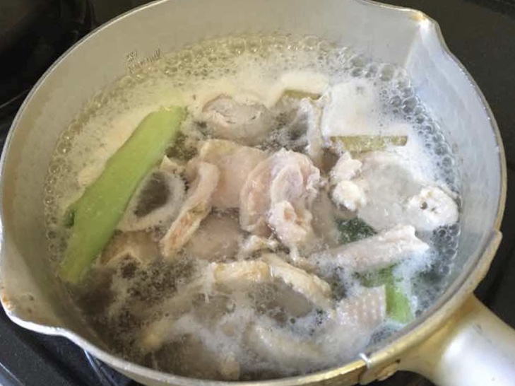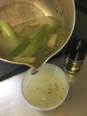 さっきの鶏皮を茹でた茹で汁はスープに