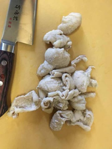 販売されてるのは首皮が中心だから、食べるとちょっとだたけ臭みがあるのよね