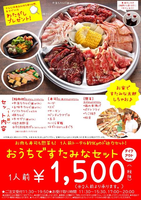 肉・寿司・惣菜が1人前計約1kgのド迫力で1,500円! すたみな太郎がテイクアウト専用