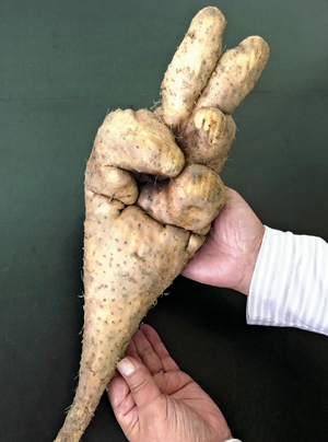 川俣町小神の農業高木茂男さん(73)方で、ピースサインをしている手の形にそっくりの山芋が収穫され、話題を呼んでいる。