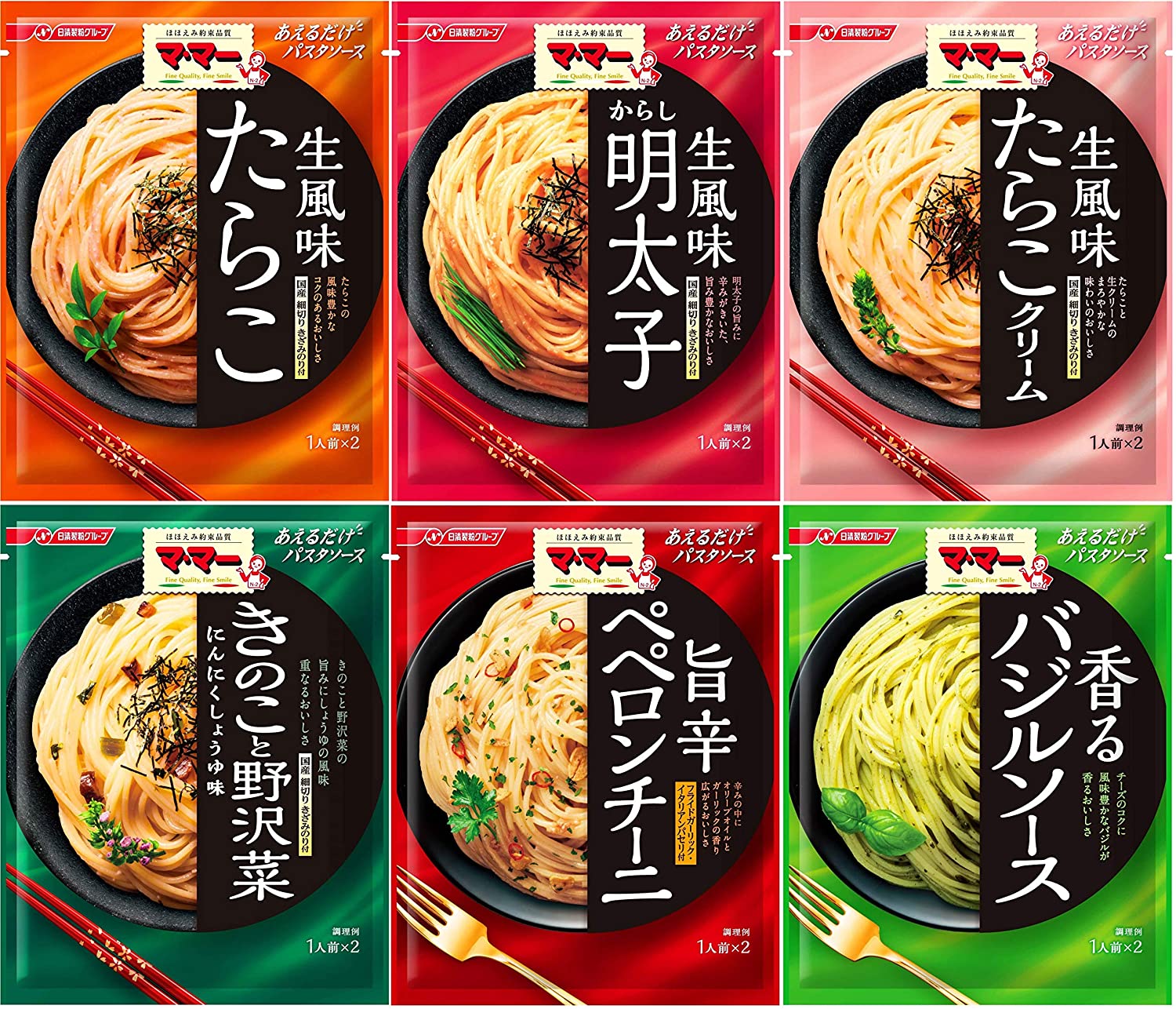 マ・マー あえるパスタソース 6種 簡単・便利シリーズ(たらこ生風味、からし明太子生風味、たらこクリーム生風味、きのこと野沢菜、ペペロンチーニ、バジルソース)
