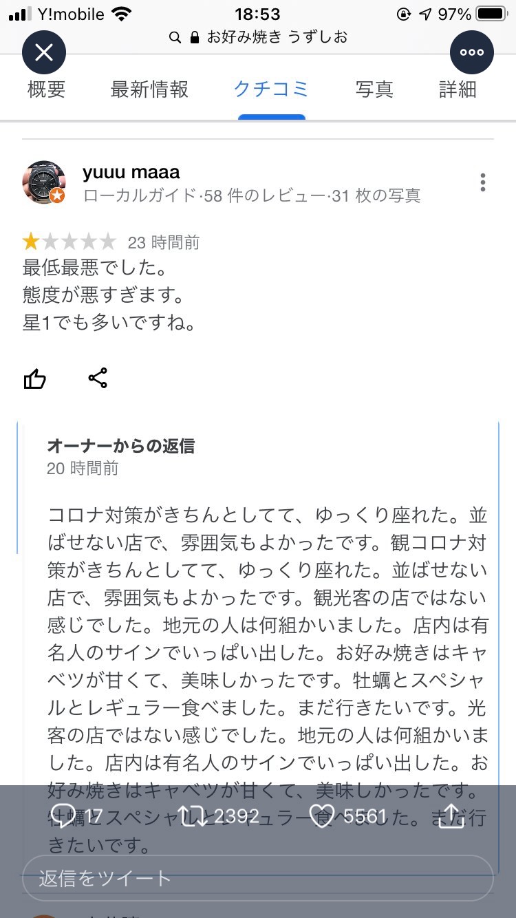 【悲報】広島で大人気のお好み焼き屋、自演をミスる