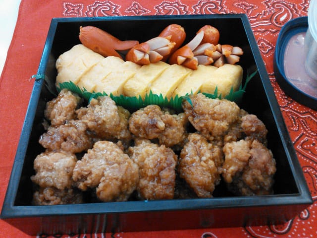 運動会のお弁当的に唐揚げ、玉子焼き、タコさんウインナーとか。海苔巻きも欲しいところ。