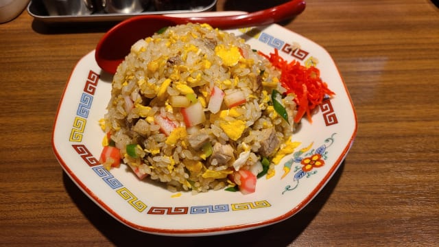 チャーシュー、玉葱、人参、ピーマンが米粒大まで微塵切りにされ、米と一緒に炒められた炒飯(玉子なし)。