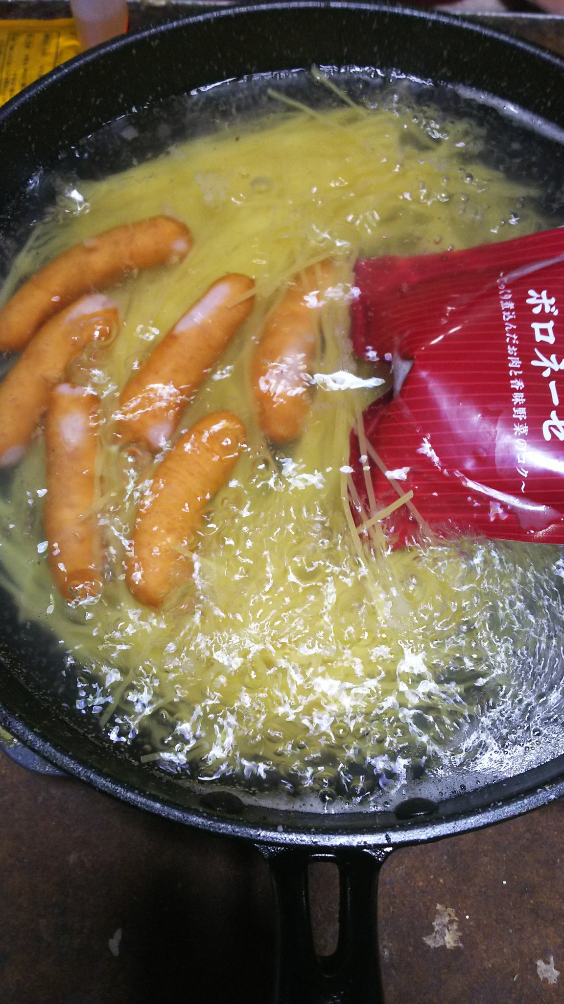 フライパンで茹でる時は必ず折って入れるわ。その方がやり易い。