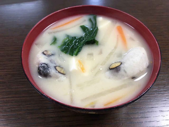 納豆をよくすり鉢で擦った納豆を味噌汁に入れてもちを入れる