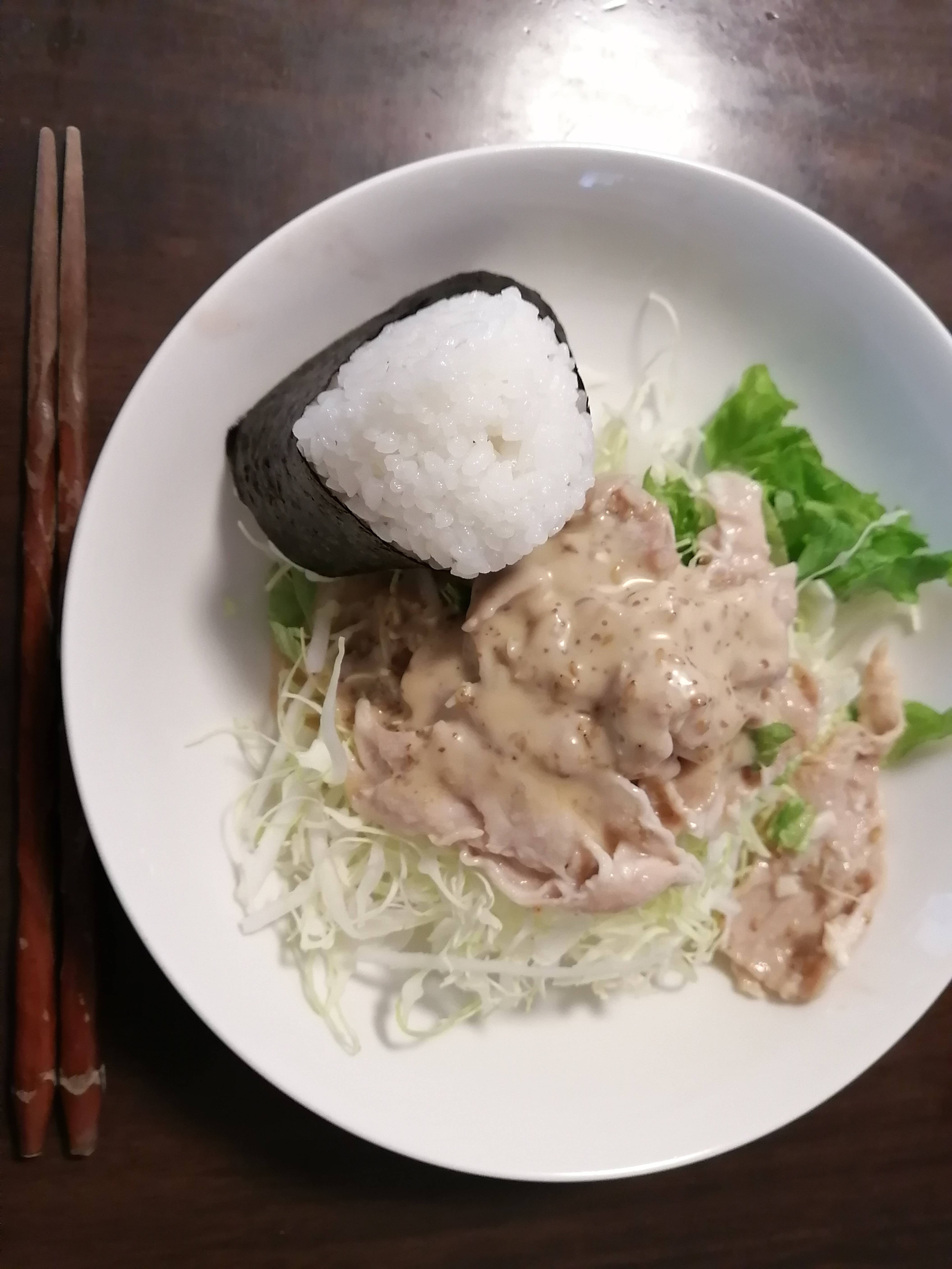 サラダをガラス器に盛って、インスタント味噌汁をちゃんとした塗りのお椀に入れてお湯注いで、横にサラダチキンを切って皿に並べて、平皿におにぎり置けよ