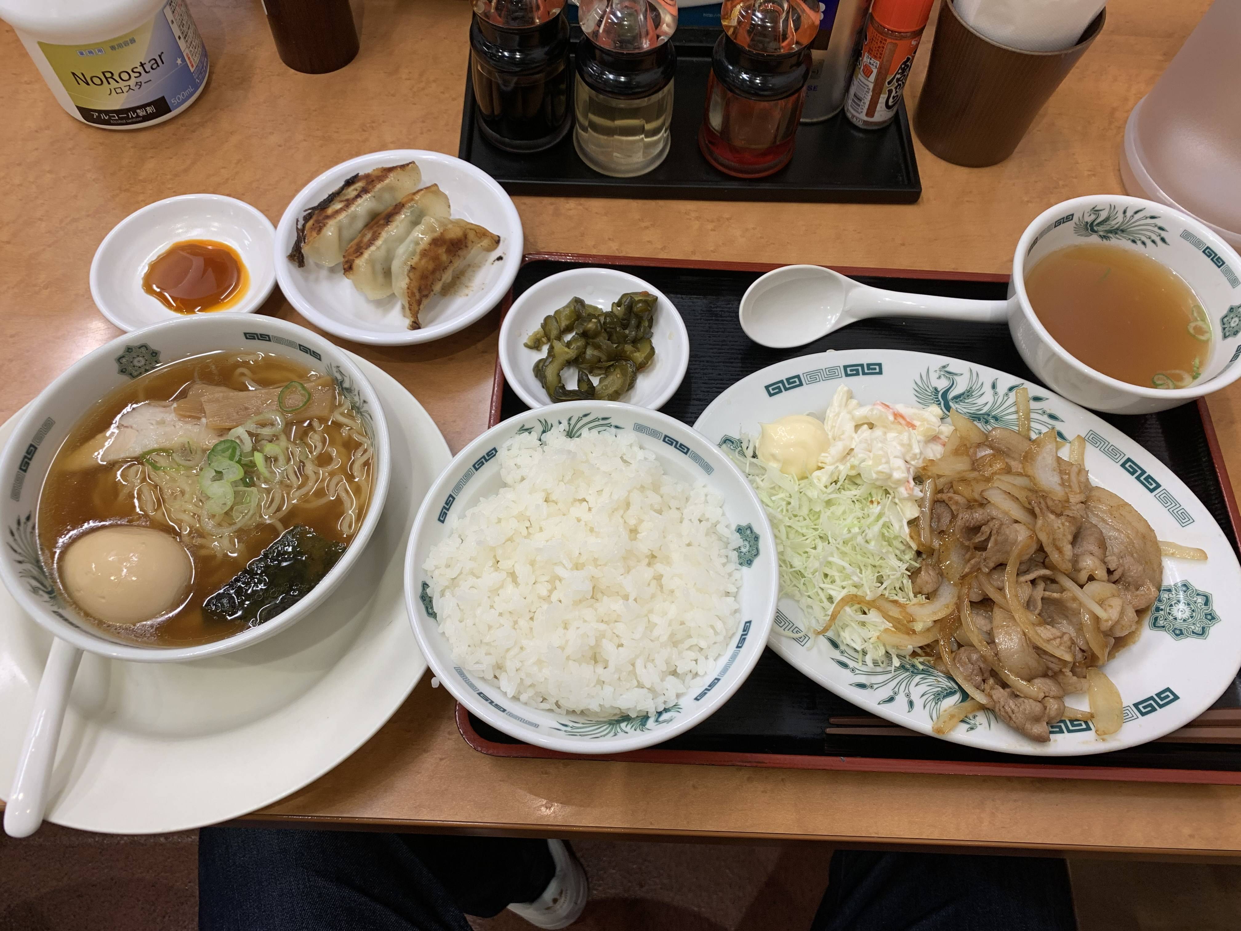 生姜焼き定食+半ラーメン+餃子だろ? ラーメンが通常サイズだったら無理だが腹減ってればこれは行ける