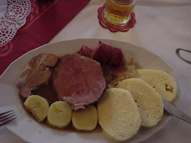 グラーシュ?ビーフシチューみたいで旨いし付け合わせの蒸しパンもいい