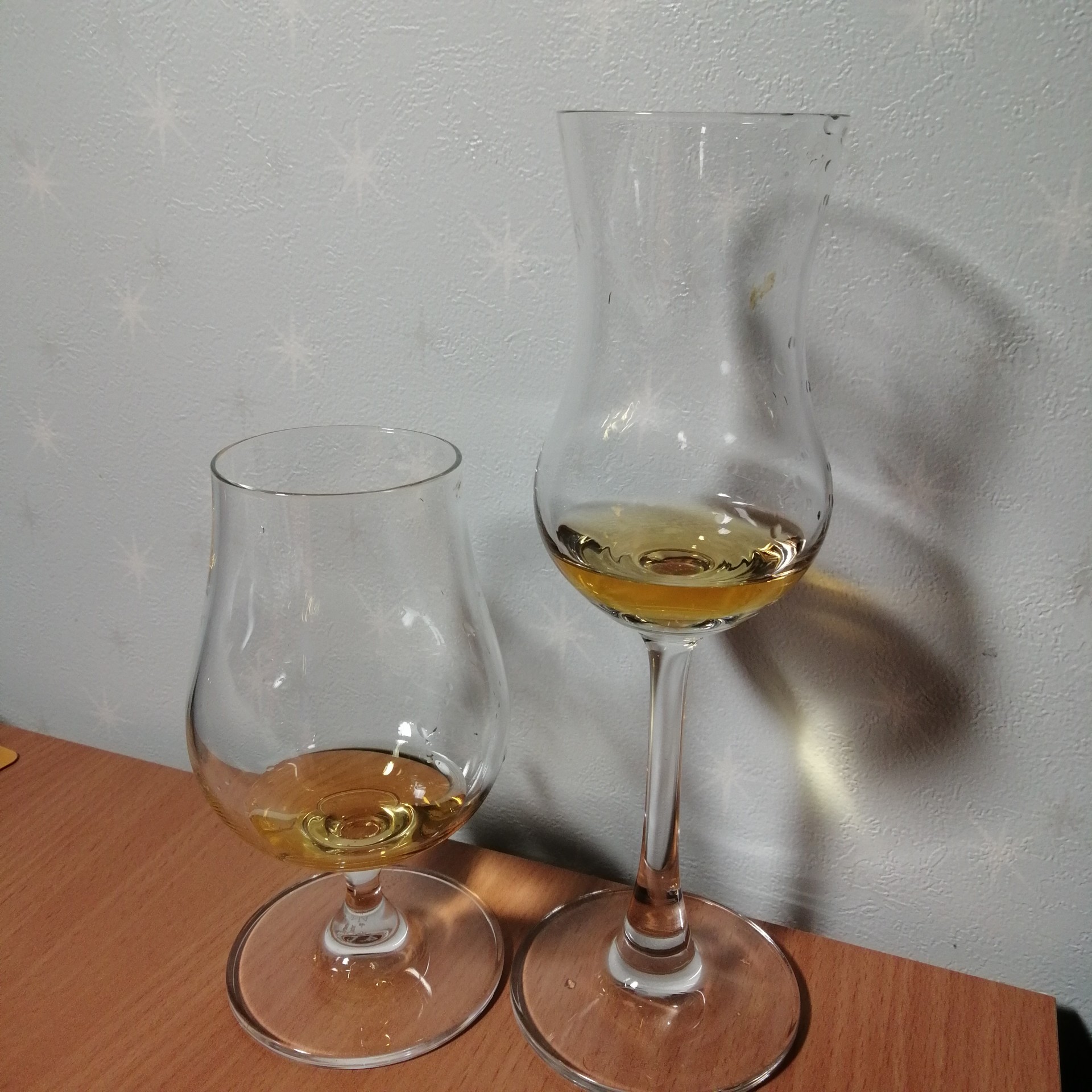 専用グラス(無料)でウィスキー飲んでる。ロックグラスよりこっちのがイイ