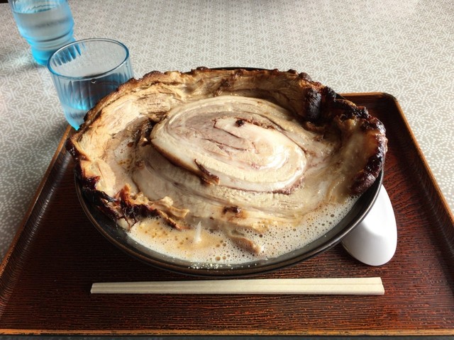 どっかにどんぶりのフタみたいなチャーシューのってるラーメンがあったはず。