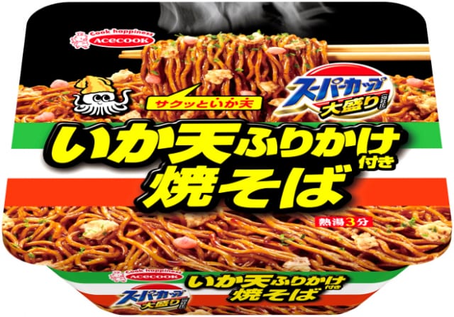 エースコック「スーパーカップ大盛り いか焼そば」復活、「いか天ふりかけ焼そば」新登場も エースコック(大阪府吹田市、村岡寛社長)は3月22日から「スーパーカップ大盛り いか天ふりかけ焼そば」(税別210円)、4月19日から「(コンビニ限定)スーパーカップ大盛り いか焼そば」 (税別240円)を発売する。 2019年に販売終了した「スーパーカップ大盛り いか焼そば」をコンビニエンスストア限定で復活するとともに、「いか焼そば」復活を模索する開発過程で新たに誕生した「いか天ふりかけ焼そば」を新発売するもの。 「スーパーカップ大盛り いか焼そば」は、販売終了後も消費者や取引先から再販を望む声があり、再販に向けて模索を続けてきた中で、「いか天」という食材に巡り合った。めんとソースの味わいはそのままに、「いか天ふりかけ」を入れることで「本物以上の食べ応えと以下の風味を楽しめる商品に仕上がった」とする。 https://www.ssnp.co.jp/news/noodles/2021/02/2021-0224-1641-16.html