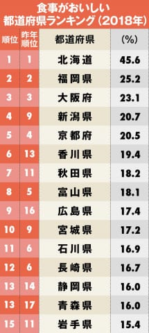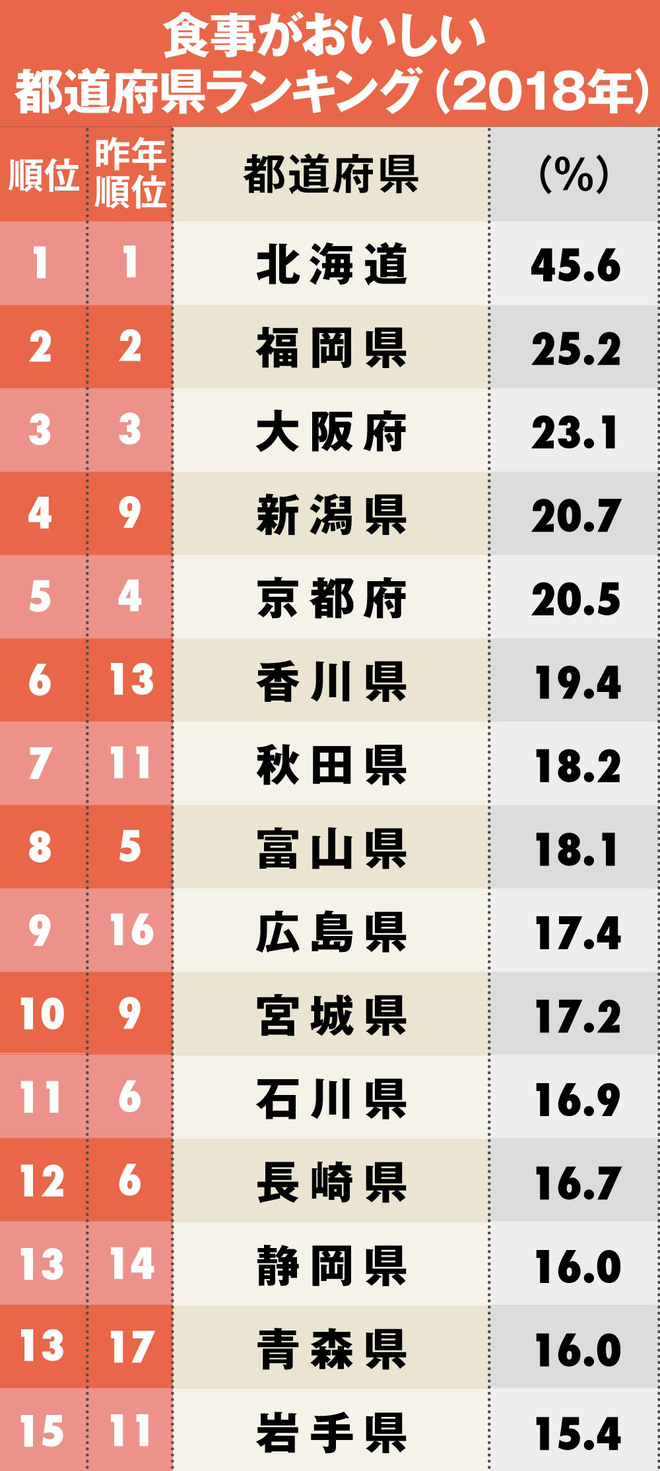 「食事がおいしい」都道府県ランキング 1位 北海道 2位 福岡県 3位 大阪府 4位 新潟県 5位 京都府 6位 香川県 7位 秋田県 8位 富山県 9位 広島県 10位 宮城県 https://diamond.jp/articles/-/203605