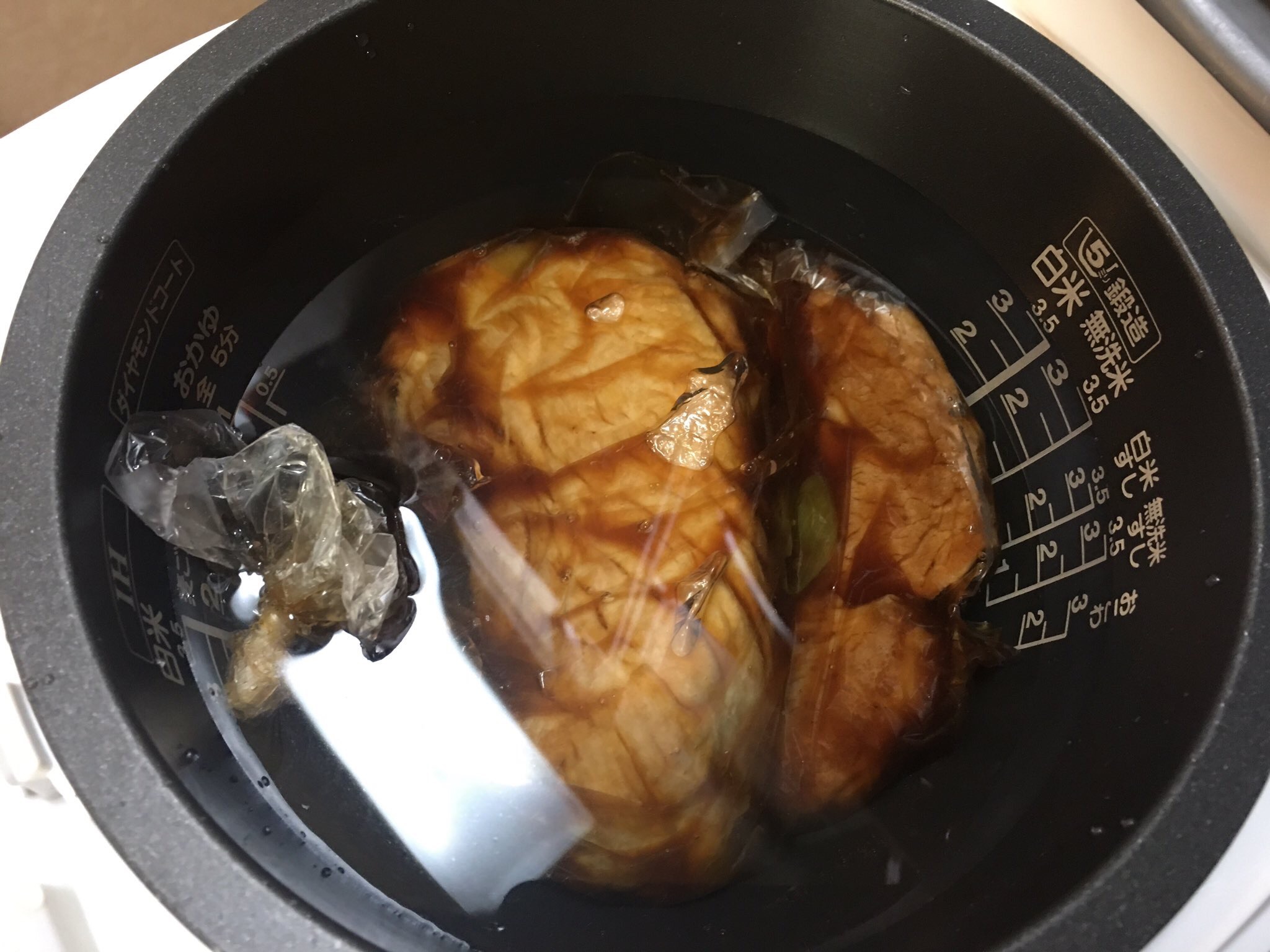 炊飯器でチャーシュー作った事あるけど、70℃のお湯とジップロックに入れた豚肉とタレたで保温で3時間