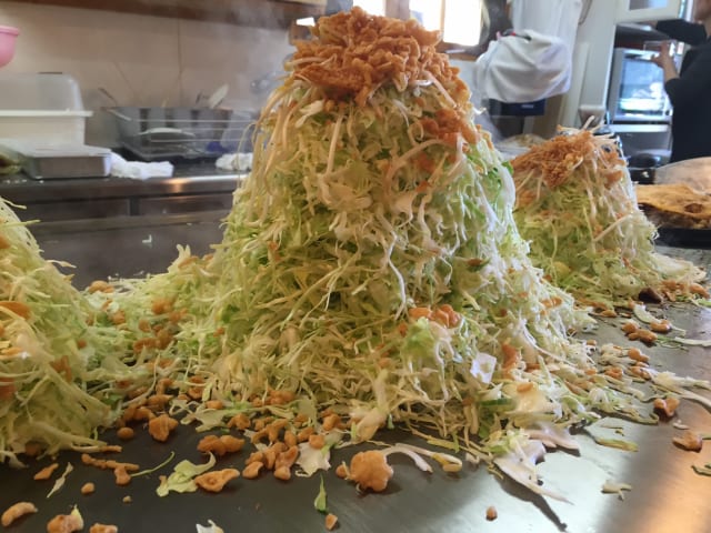 この上に薄い生地乗せて押しつぶすとキャベツの水分で蒸されてぺちゃんこになるからヘラ2枚使ってひっくり返すんや