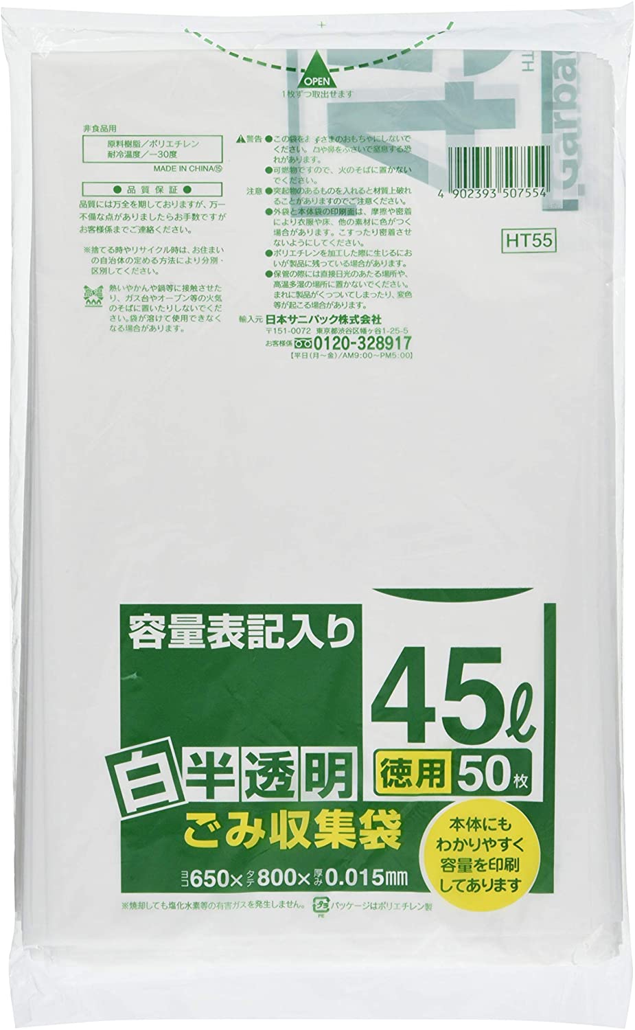 HT55 白半透明ごみ袋 45L 50枚 375183