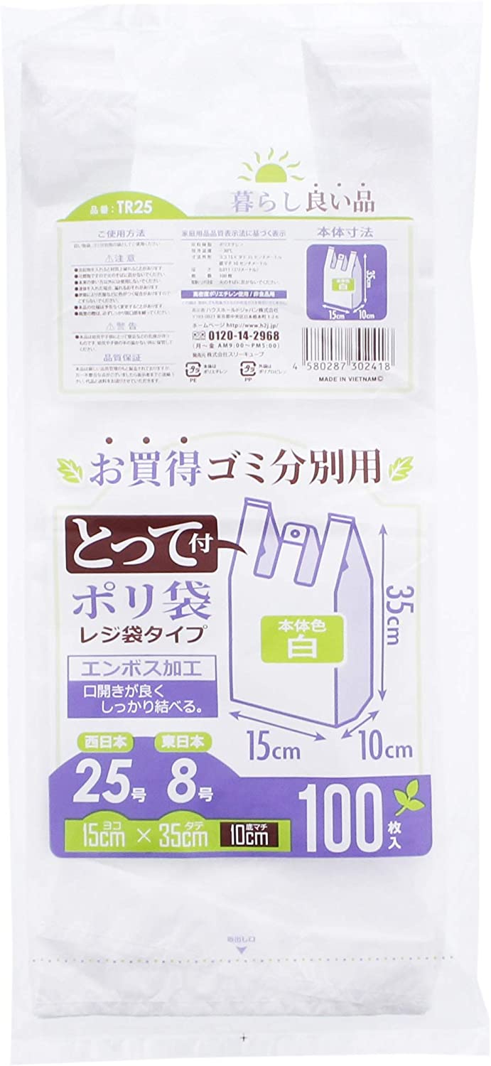 ハウスホールドジャパン レジ袋 とって付 ゴミ分別用ポリ袋 100枚入 白 TR25 約15×35×マチ10cm