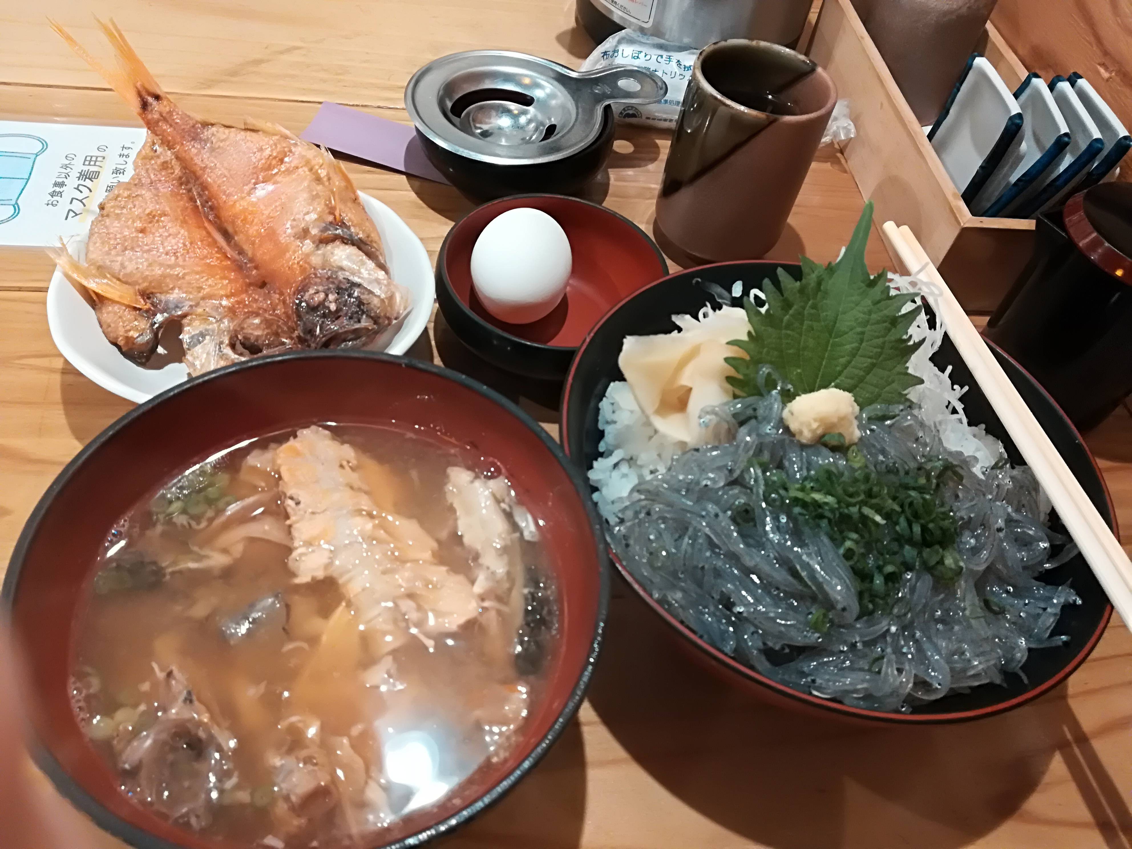 シラス丼、あら汁、干物、生卵という全体的にしょっぱい組み合わせで