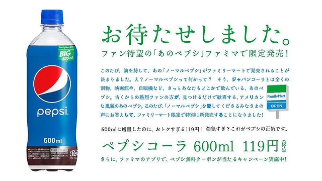 古くからの熱烈なファンは見つけるだけで歓喜するという、アメリカンな風貌の「ノーマルペプシ」が、600mlで119円(税込)という強気の価格設定で再び市場に登場。