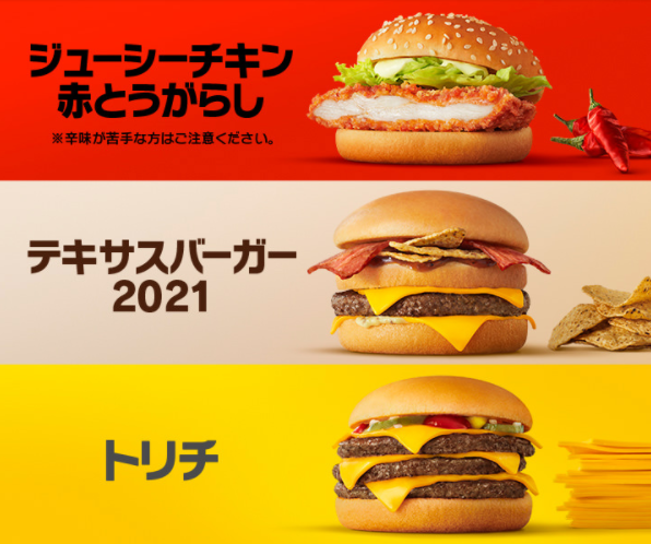 【速報】マクドナルド「ジューシーチキン 赤とうがらし」「テキサスバーガー2021」「トリチ(トリプルチーズバーガー)が復活キタ━━━━(゚∀゚)━━━━!!