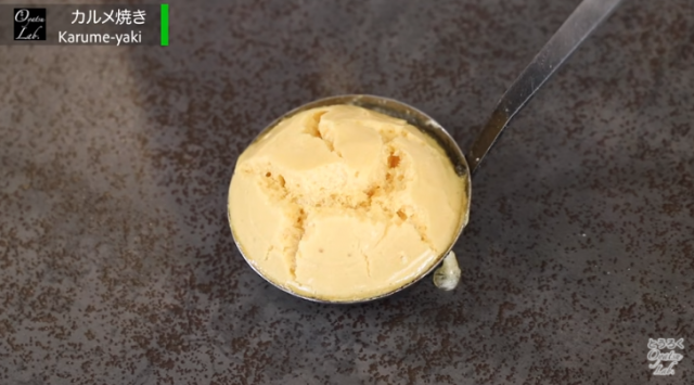 熱した入れ物の中で砂糖をカラメル化させるのと、重曹(タンサン)をアワアワにするのを同時にするという技。そしてそれが膨らみ切り、かつ焦げるより先に抜く。