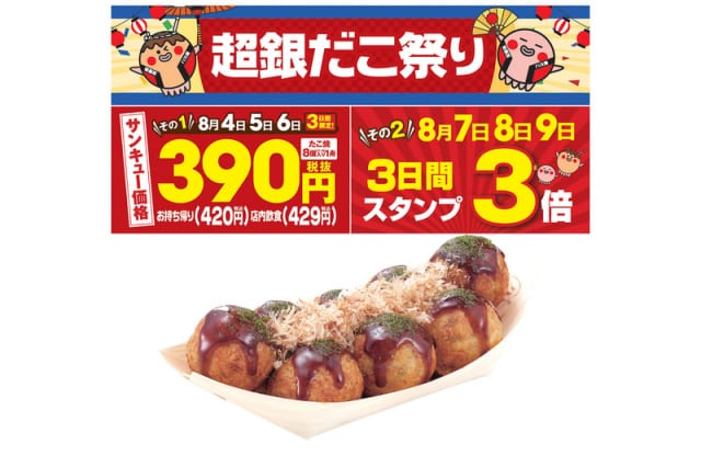 築地銀だこ、たこ焼が「390円(サンキュー価格)」の「超銀だこ祭り」  築地銀だこ(ホットランド)は、「超銀だこ祭り」を8月4日から9日まで実施する。  前半の8月4日~6日は、「たこ焼(ソース、8個入り)」を「390円(サンキュー価格)」(税別)で販売(テイクアウト420円、イートイン429円)。  後半の8月7日~9日は、銀だこスタンプカードのスタンプを3倍にする。例えば通常「たこ焼(6個入り以上)」を1舟購入で1スタンプのところ、3スタンプになる。 https://gourmet.watch.impress.co.jp/docs/news/1340279.html